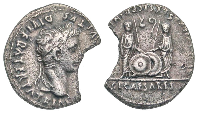 Augustus. 27 B.C.-A.D. 14 AR denarius (20.3 mm, 3.07 g, 11 h). Lyons mint, struck 2 B.C. - A.D. 4 CAESAR AVGVSTVS DIVI F PATER PATRIAE, laureate head right / AVGVSTI F COS DESIG PRINC IVVENT, C L CAESARES, Gaius and Lucius Caesar standing facing; shields and spears between; simpulum and lituus above. RIC 207; BMCRE 519; RSC 43. gVF, large flan chip.