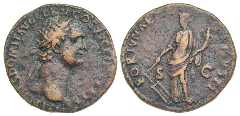 Domitian. A.D. 81-96. AE dupondius (27.4 mm, 9.73 g, 5 h). Rome mint, struck A.D. 90-91. IMP CAES DOMIT AVG GERM COS XVI CENS PER P P, radiate head right / FORTVNAE AVGSTI, S-C, Fortuna standing left, holding cornucopia and rudder. RIC 705; BMCRE 444. Fine, rough.