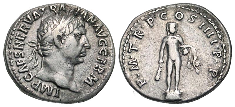 Trajan. A.D. 98-117. AR denarius (19.1 mm, 3.30 g, 5 h). Rome mint, struck A.D. 101-102. Scarce. IMP CAES NERVA TRAIAN AVG GERM, laureate head right / P M TR P COS IIII P P, statue of Hercules standing facing, draped in lion skin, holding club and apple. RIC 49; BMCRE 86; RSC 234. gVF.