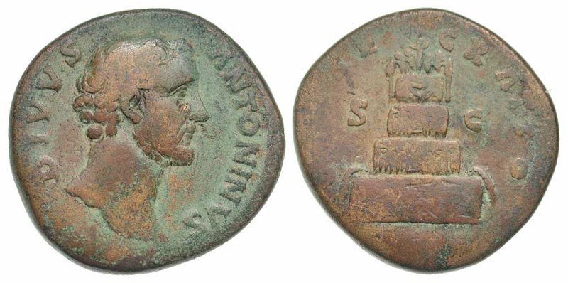 Lot 60-223. Divus Antoninus Pius. Died A.D. 161. AE sestertius. Rome mint, struck A.D. 179-180.