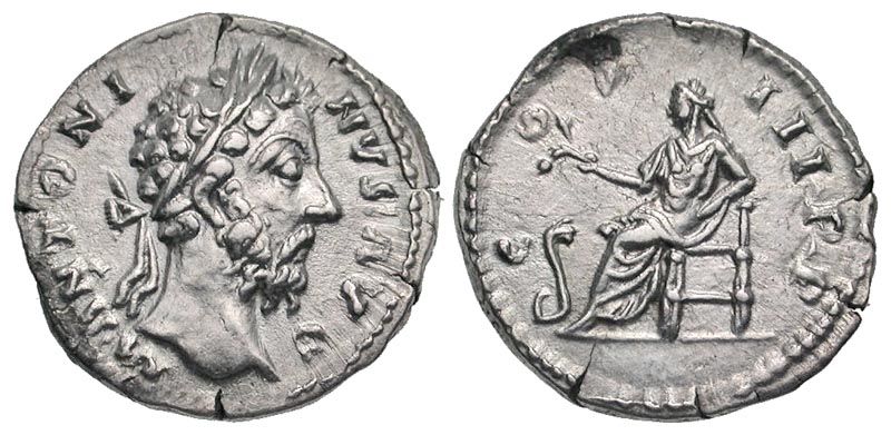 Marcus Aurelius. A.D. 161-180. AR denarius (18.6 mm, 3.05 g, 5 h). Rome mint, struck A.D. 178. M ANTONINVS AVG, laureate head right / COS III P P, Salus seated left, holding branch, serpent rising from ground to left. RIC 425; BMCRE p. 486 note; RSC 152b. VF. Rare.