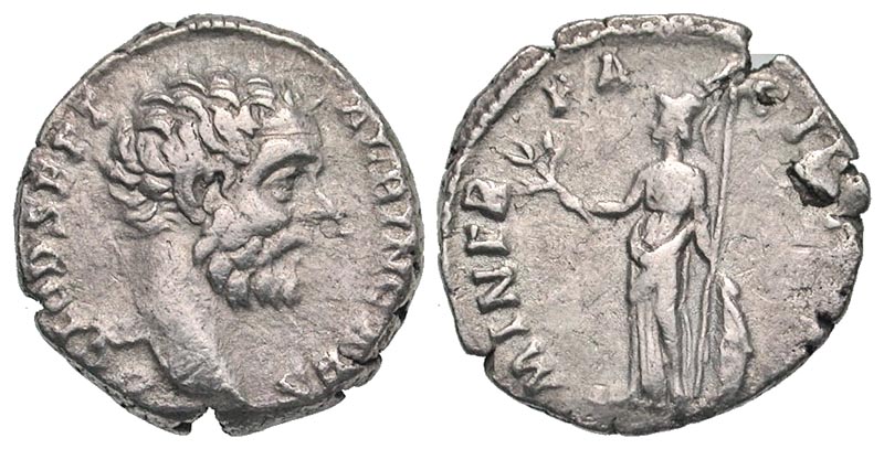 Clodius Albinus. As Caesar, A.D. 193-195. AR denarius (18.3 mm, 2.04 g, 5 h). Rome mint, struck A.D. 194-195. D CLOD SEPT ALBIN CAES, bare head right / MINER PACIF COS II, Minerva standing left, holding branch, spear, and leaning on shield. RIC 7; BMCRE 96; RSC 48. Fine.