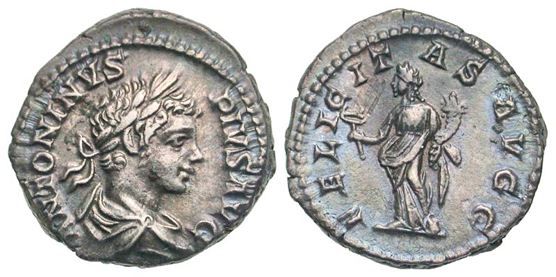 Caracalla. A.D. 198-217. AR denarius (18.6 mm, 3.63 g, 1 h). Rome mint, struck A.D. 205. ANTONINVS PIVS AVG, laureate, draped, and cuirassed bust right / FELICITAS AVGG, Felicitas standing left, holding caduceus and cornucopia. RIC 127; RSC 64; BMCRE 276. Toned EF.