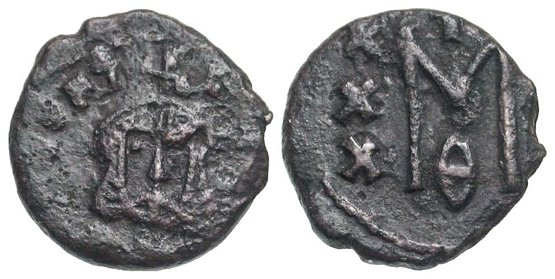 Theophilus. 829-842. AE follis (14.9 mm, 1.68 g, 6 h). Syracuse mint. ЄOFIL bASIL, crowned bust facing with short beard, wearing chlamys, holding globus cruciger / Large M, XXX to left, cross above, [NNN to right], Θ below. SBV 1681; DOC 30. VF. Scarce.