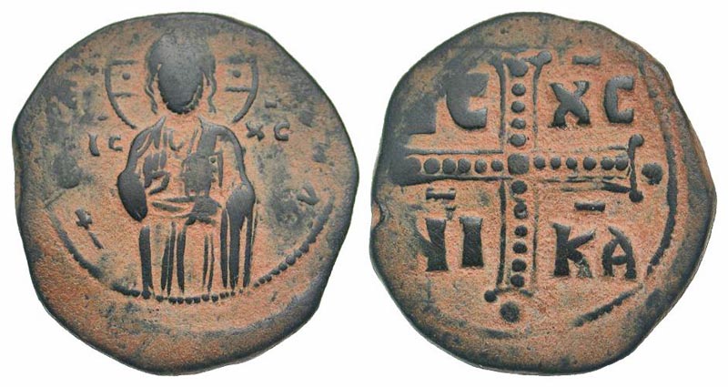 Anonymous (attributed to Michael IV). Ca. 1034-1041. AE "Class C" anonymous follis (28.8 mm, 9.05 g, 6 h). Constantinople mint. ЄmmANOVHA, IC-XC, three-quarter length figure of Christ standing facing, wearing nimbus crown, pallium, and colobium, and raising right hand in benediction; in left hand, he holds the book of Gospels / IX-XC/NI-KA, jewelled cross with pellets at each extremity. SBV 1825; DOC p. 681-4. aVF, sandy patina.