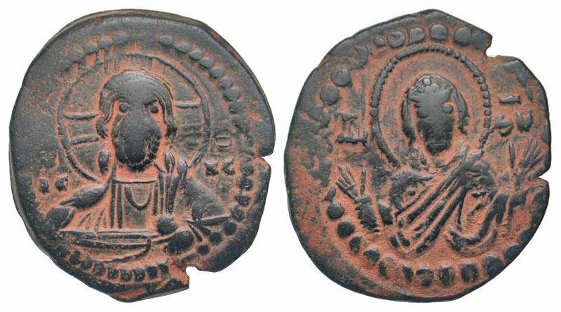 Anonymous (attributed to Romanus IV). Ca. 1068-1071. AE "Class G" anonymous follis (27.9 mm, 6.20 g, 5 h). Constantinople mint. IC-XC, Bust of Christ facing with nimbate cross, pallium and colobium, and raising right hand in benediction, scroll in left hand / MP-ΘV, facing bust of the Virgin Mary, nimbate and wearing pallium and maphorium. SBV 1867; DOC p. 692-4. VF, attractive red patina.
