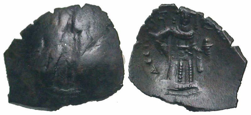 John Comnenus-Ducas. Emperor, 1237-1242. BI trachy (16.6 mm, 0.67 g, 11 h). Brockage strike. Thessalonica mint. Incuse of reverse / John standing facing, holding labarum and akakia, being crowned by manus Dei to upper right. cf. SBV 2214; cf. DOC 28 (larger module). F/VF.