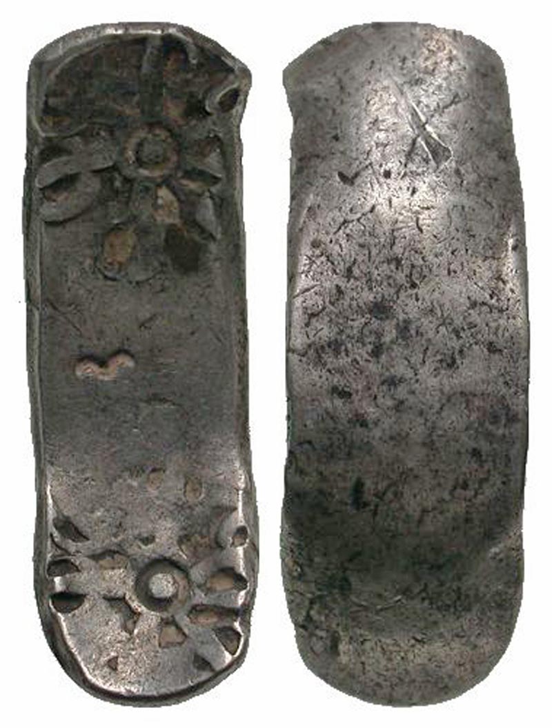 Gandhara. Maha Janapada. Ca. 500-30 B.C. AR "Bent Bar' satamana (38x13 mm, 11.22 g). Taxila mint. Radiate symbols stamped at each end / Blank. Mitchener ACW 4071-7; AIC 1. VF.