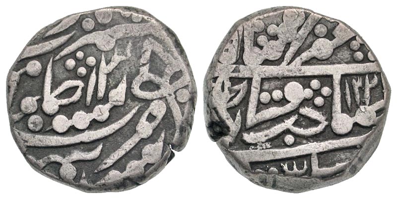 Lot 60-328. India, Princely States. Jaipur. Nazarana. 1221-1253/1806-1837. AR rupee. Sawai Madhopur mint, AH 1221, year 13. In the name of Muhammad Akbar II. Rare.