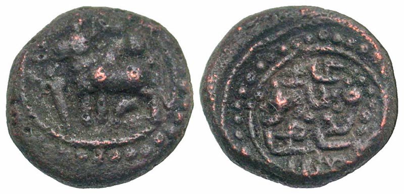 South India, Vijayanagara Empire. Shri Thirumala Raya. 15651572 . CU jital (15.3 mm, 3.54 g, 6 h). Rare. Bull standing left, daggar before / Nagari legend with symbols. K Ganesh 287. aVF.