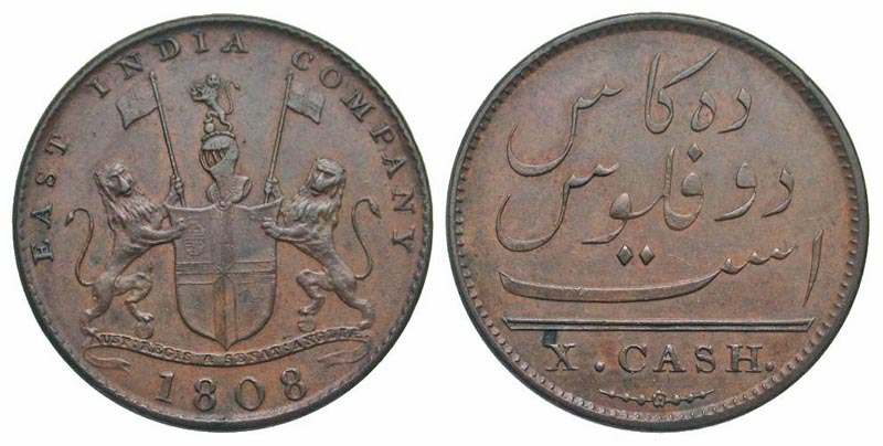 Lot 60-338. India, Madras Presidency. British East India Company. 1808. CU 10 cash. 1808.