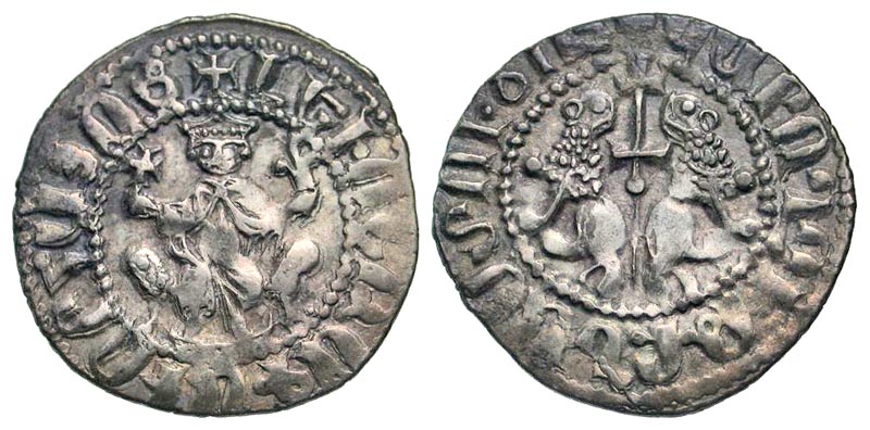 Armenian Kingdom, Cilician Armenia. Levon I. 1198-1219. AR tram (22.2 mm, 2.84 g, 1 h). Levon seated facing on lion throne, holding cross and lis, feet on footstool / Two lions rampant back-to-back, each with head reverted; patriarchal cross between them. Nerc 282; Bedoukian 225. VF.