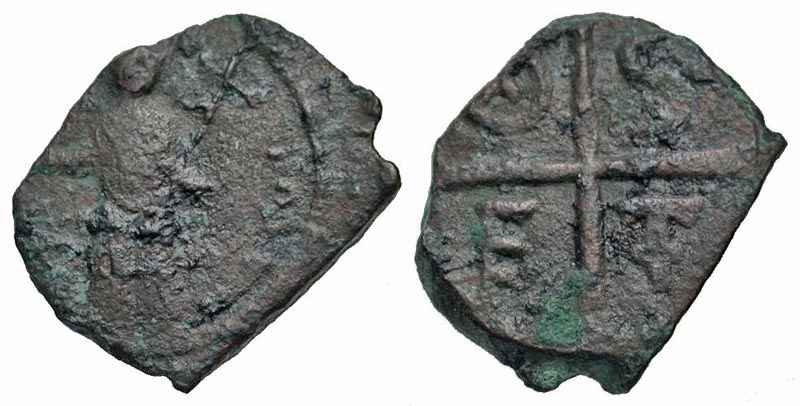 Crusader States, Principality of Antioch. Tancred. Regent for captured Bohemond I, 1104-1112 A.D.. AE follis (19.2 mm, 2.39 g, 4 h). Third type. St. Peter standing facing, raising hand in benediction and holding long cross / Cross; D-S-E-T in quarters. Metcalf, Crusades 71; CCS 6 var. (D-S-F-T). Crude Fine, struck on a small flan.
