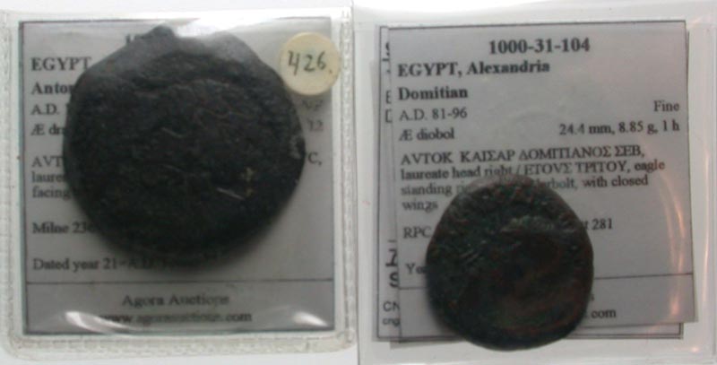 [Roman Provincial]. Lot of 2 Alexandrian Bronze Coins. Domitian diobol, eagle / Antoninus pius drachm, eagle. Fine. All group lots are sold as-is, returns not accepted. The coins shown are the exact coins you will receive.