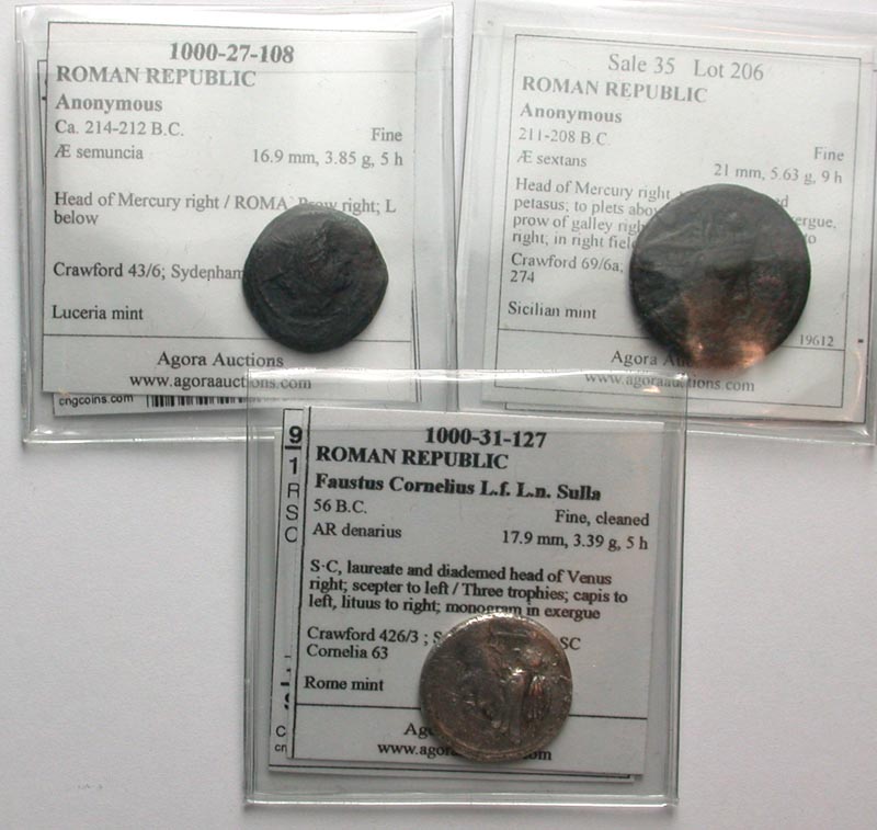 [Roman Republican & Imperatorial]. Lot of 3 Roman Republican Coins. Including Anonymous, semuncia / Anonymous, sextans / Faustus Sulla, denarius. Fine. All group lots are sold as-is, returns not accepted. The coins shown are the exact coins you will receive.