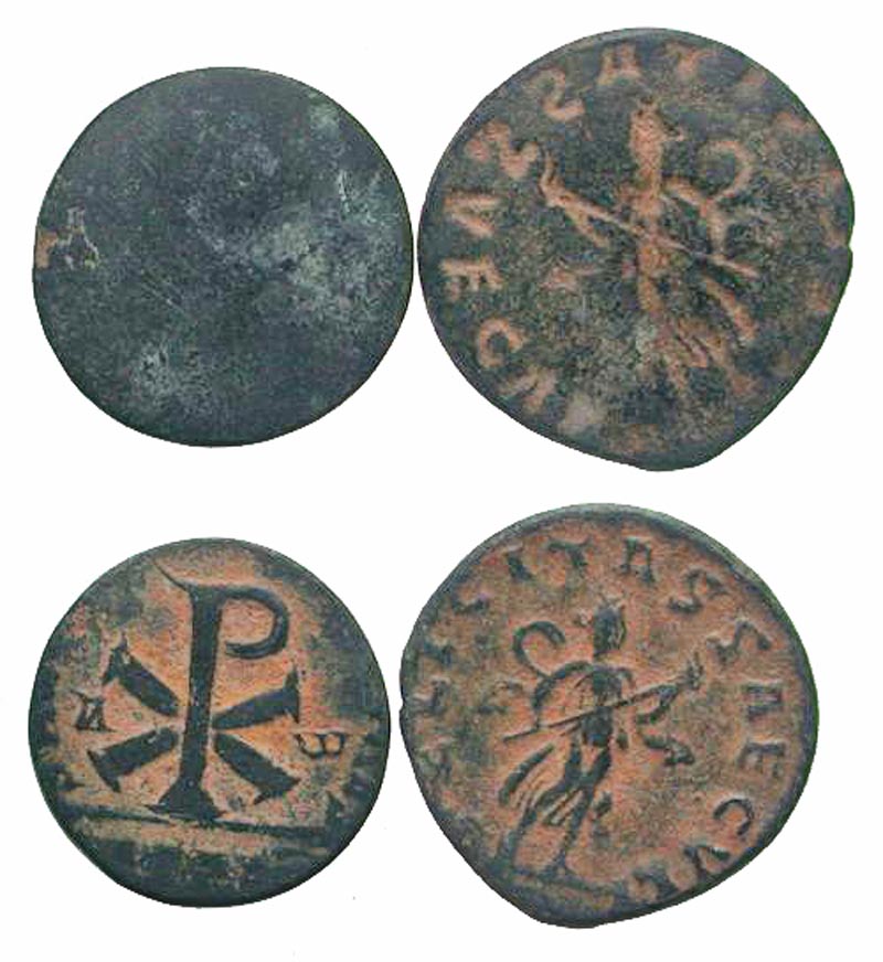[Roman Imperial]. Lot of 2 Error Coins. Gallienus (?); Incuse of reverse / SAECVLI FELICITAS, Diana lucifera advancing right //Magnentius (?); Blank obverse / Chi-Rho. Both coins aVF.