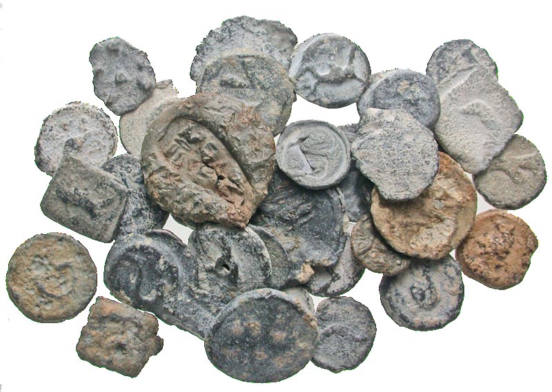 [Roman Imperial]. Lot of 32 PB Roman Tesserae. An assortment of designs including: animals, Tyche, letters and numerals, and every day objects. Lower grade. All group lots are sold as-is, returns not accepted. The coins shown are the exact coins you will receive. Ex George D'Ambrosio collection of Roman coins and tesserae.