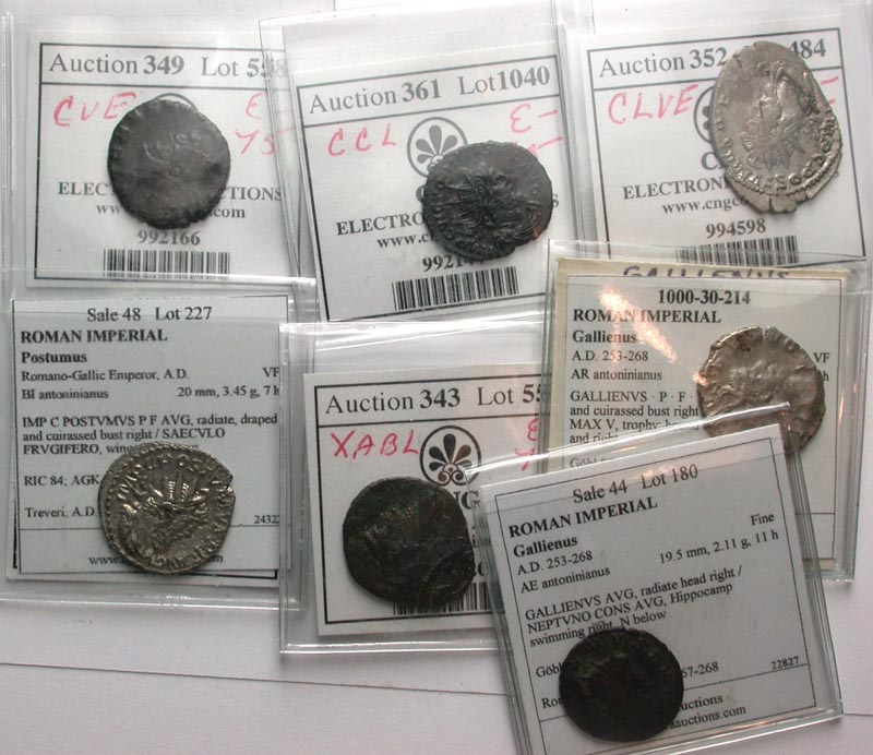 [Roman Imperial]. Lot of 7 Roman Antoninianii. Including (4) Gallienus, river god, trophy, hippocamp, doublestruck / (2) Postumus, winged caduceus, Virtus / Victorinus, Virtus. F-VF. All group lots are sold as-is, returns not accepted. The coins shown are the exact coins you will receive.