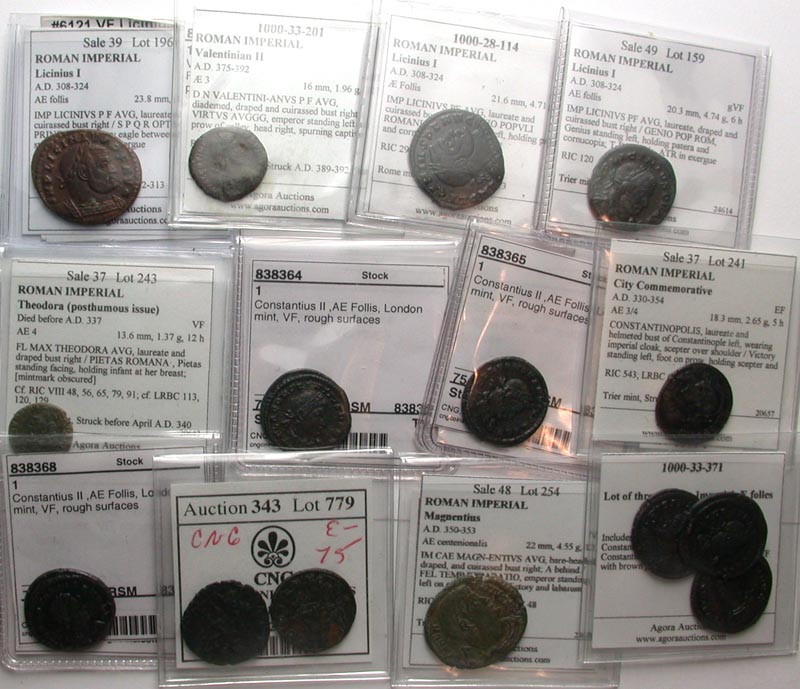 [Roman Imperial]. Lot of 15 Late Roman Bronze Coins. Including an AE denarius of Aurelian, (3) Licinius I, (4) Constantius II, Constantine II, Crispus, city commemorative, Theodora, Magnentius, Valens, Valentinian II. aVF or better. All group lots are sold as-is, returns not accepted. The coins shown are the exact coins you will receive.