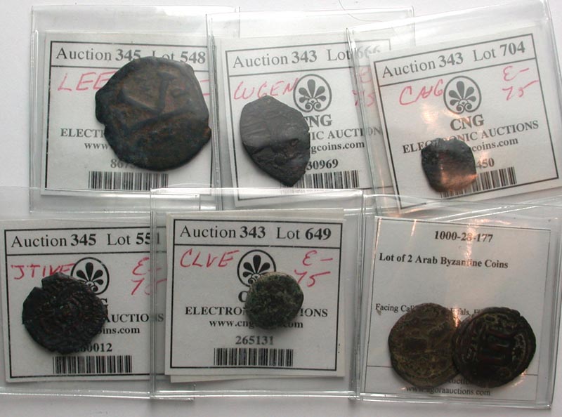 [Byzantine]. Lot of 7 Byzantine Bronze Coins. An assortment of early types, also includes two Arab-Byzantine coins. Fine. All group lots are sold as-is, returns not accepted. The coins shown are the exact coins you will receive.