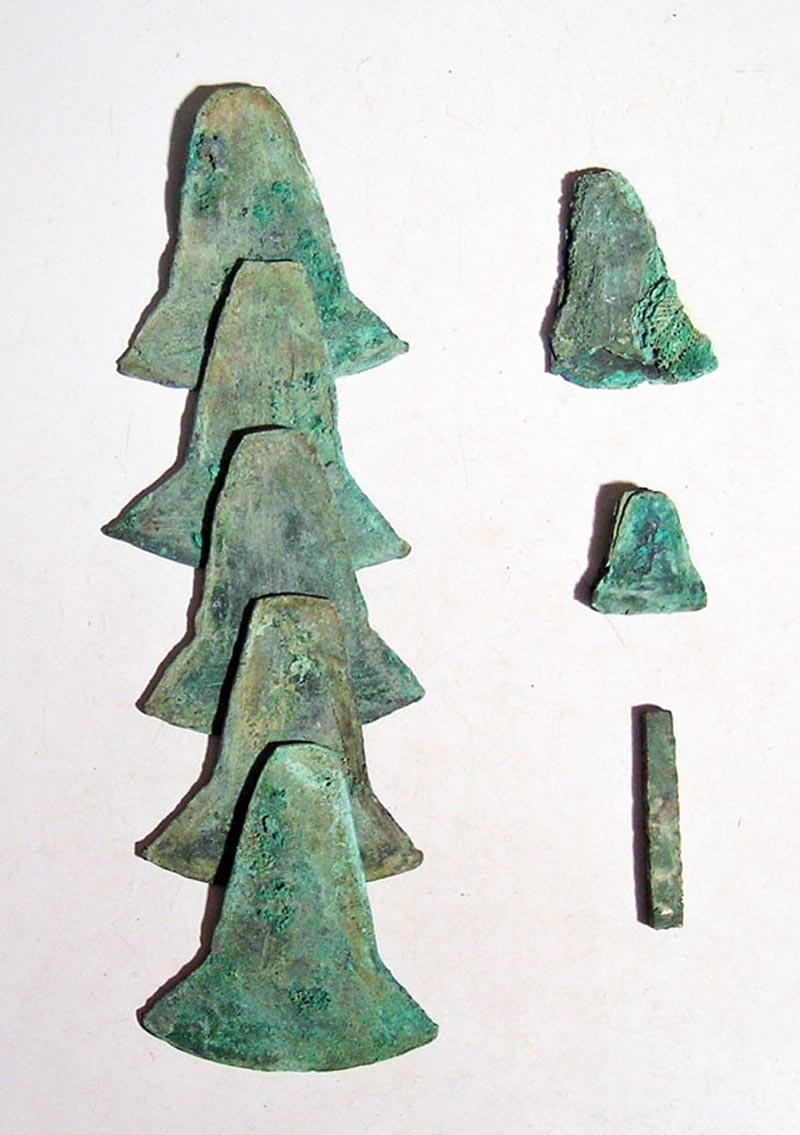 Inca Trade Currency from Ecuador, ca. 1400 - 1500 AD. A group of Inca copper trade currency from Ecuador, ca. 1400 - 1500 AD. There is a set of five ingots each 2-1/4 long, a couple that are 1-1/8 long and wrapped together with a textile remnant, a group of 1 examples, as well as a copper bar. The smaller ones of these are stuck together, but could be separated with some careful effort, for a total of about fifteen. Ex New World Artifacts Gallery. Value range: $250 - $400.