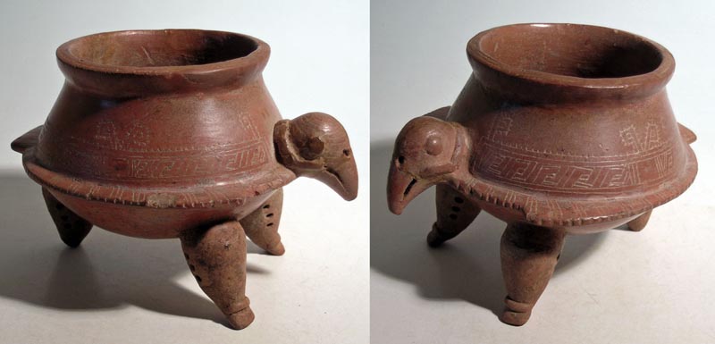 Avian Effigy from Costa Rica, ca. 200 - 500 AD. An exquisite avian vessel from Costa Rica, ca. 200 - 500 AD. This rare Guinea Incised example is 7 long and rests on a trio of hollow legs containing rattles. Appliquéd to the front is a hollow head with curved beak, with wings and tail created by the incised flange encircling the chamber. The intricate geometric designs decorating the walls of the chamber are characteristic of this style. Ex De Pasquale estate. Cf. Art of Costa Rica, pages 86 - 89 for similar from the Sackler collection. Value range: $425 - $600.