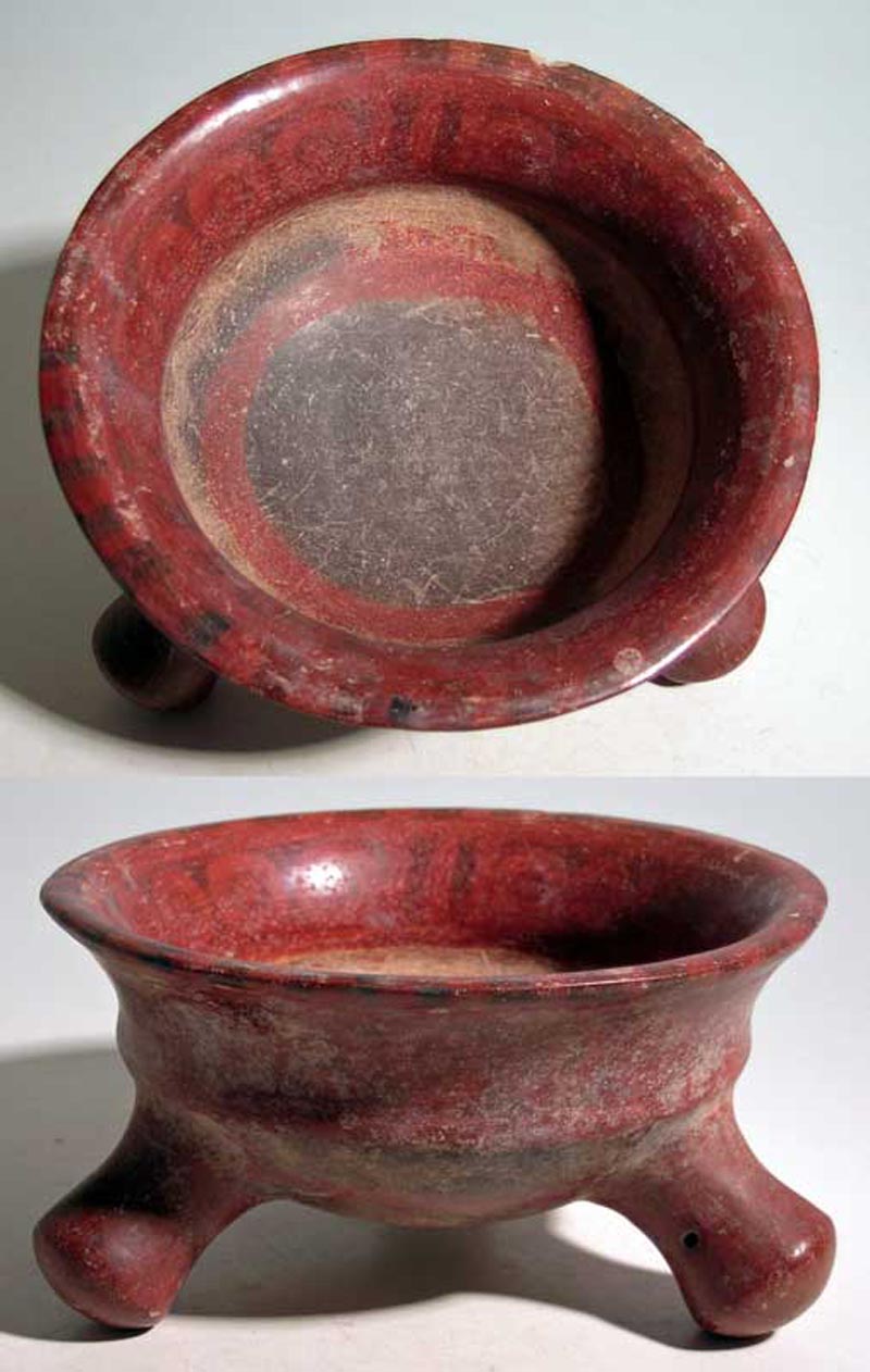 Jalisco Tripod Vessel from West Mexico, ca. 200 BC - 350 AD. A fine tripod dish from Jalisco, West Mexico, ca. 200 BC - 350 AD. It is 6-1/8 in diameter and is painted with nice resist décor inside and out. Nicely burnished, good mineral deposits. Ex Schultz collection. Value range: $200 - $300.