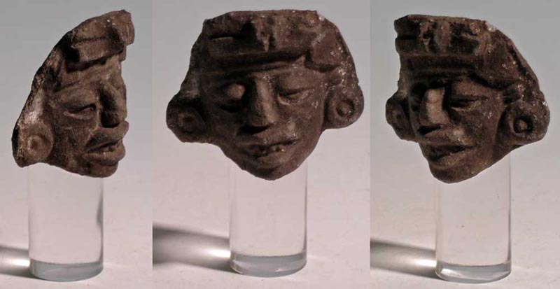 Zapotec Head from Mexico, ca. 100 - 500 AD. An excellent Zapotec head fragment from Oaxaca, Mexico, ca. 100 - 500 AD. This superbly detailed example is 2-1/8 high and depicts a deity adorned with large ear spools and a complex headdress. Teeth are visible in the open mouth. Mounted on acrylic base. Ex Schultz collection. Value range: $100 - $200.