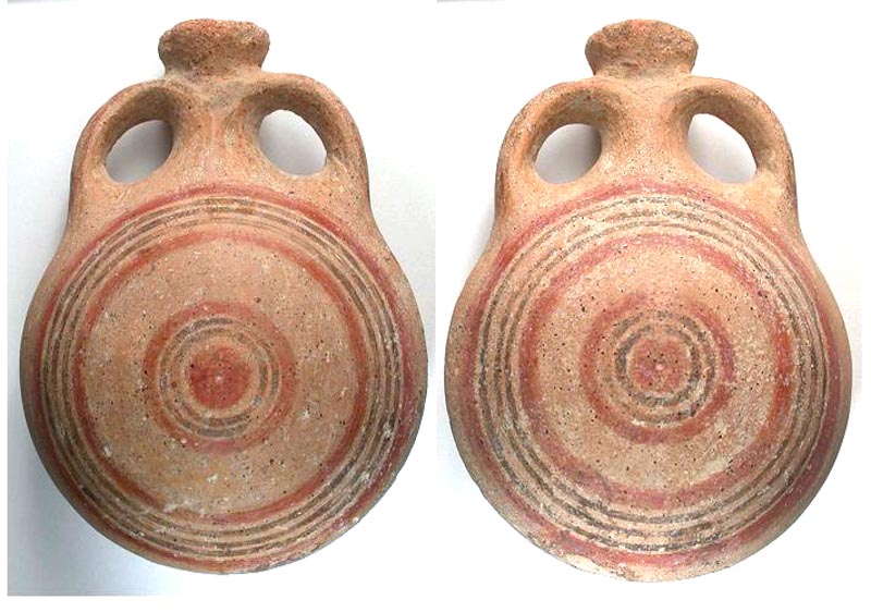 A Beautifully Decorated Greek Flask. Ca. 4th-1st century B.C. 5x3.5 inches. Beautifully painted with a circular pattern in red and brown. Intact, slight chip at its base. Value range: $150-$200.