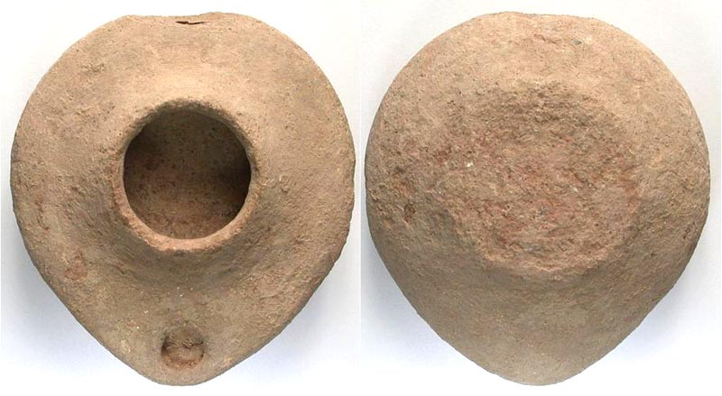 Simple Roman Oil Lamp. An undecorated oil lamp, handle broken off. Ca. 2nd century BC-1st century AD. No decorations. 3.5x3 inches. Value range: $25-50.
