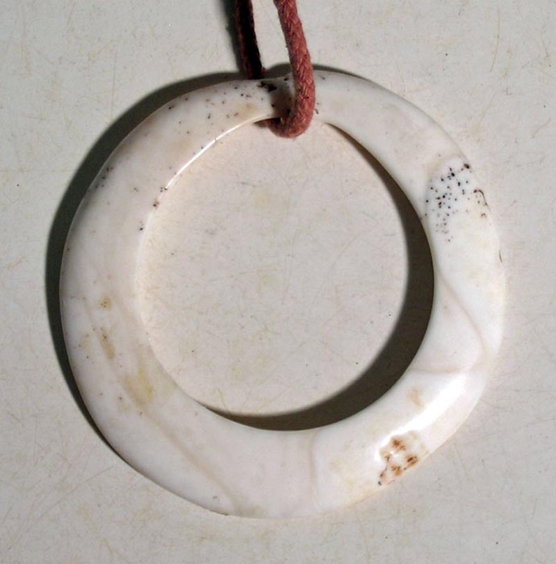 Abelam currency ring from Papua New Guinea, ca. early 20th Century. An excellent Abelam currency ring, Yua, from Papua New Guinea, ca. early 20th Century. The ring is made from tridacna shell and is 3-1/4 in diameter. This yua is tapered at both interior and exterior edges and has a smooth, satiny surface. The notched area on the edge refers to the totem bird of the area, the hornbill. Ex New England estate. Value range: $300 - $500.