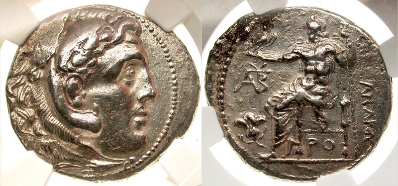 Macedonian Kingdom. Alexander III the Great. 336-323 B.C. AR tetradrachm (16.91 g). Rhodes, ca. 201-190 B.C. Head of Alexander as Hercules right, wearing lion-skin headdress, paws tied at throat / ΑΛΕΞΑΝΔΡΟΥ, title vertically downwards to right of Zeus Aetephoros enthroled left holding eagle and scepter, right leg drawn back; in left field, ABTY monogram over rose; beneath throne, PO. Price 2515. NGC Certified XF, Strike 4/5, Surface 3/5, previously cleaned and re-toning; some roughness in reverse fields. NGC Certified XF.