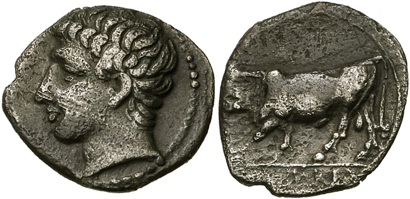 Sicily, Panormos. Ca 405-380 B.C. AR litra (10 mm, .50 g, 7 h). Male head left / Bull standing left. Jenkins, Punic, p. 75, 12 var. (swastika on obverse, legend above bull); CNP 395; HGC 2, 1050 corr. (litra) var. (same). Toned VF, some porosity.