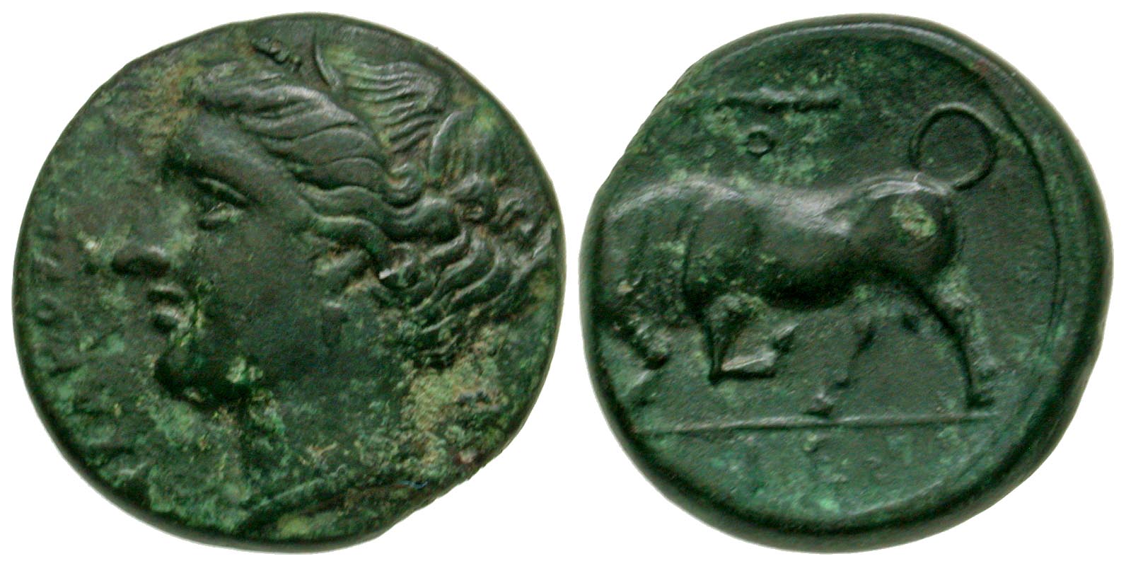 Sicily, Syracuse. Hieron II. 275-215 B.C. AE 19 (19 mm, 5.41 g, 9 h). ΣYPAKOΣIΩN, head of Kore left, wearing wreath of grain-ears and earrings; behind head, flower / Bull butting left; above, club and O; in exergue, IE; linear border. SNG Cop 863; Cf. SNG ANS 572. VF, obverse fields a bit rough.