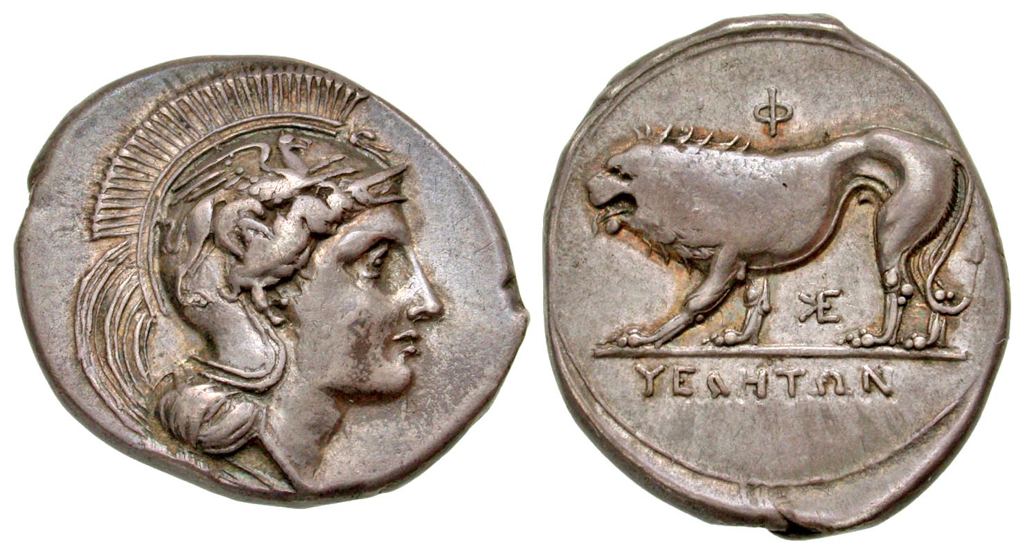 Lucania, Velia. Ca. 334-300 B.C. AR didrachm (24.1 mm, 7.60 g, 8 h). Kleudoros group. Helmeted head of Athena right, wearing Attic helmet surmounted by griffin / Lion standing left; Φ above, monogram below. In exergue YEΛHTΩN. Williams 297 (O165/R228); HN Italy 1289; SNG Ashmolean 1233; SNG Copenhagen 1553; BMC 60; Dewing 460. Choice EF. Choice.