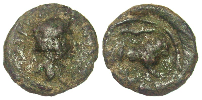 Samaria, Caesarea Maritima. Hadrian. A.D. 117-138. Æ 14 (13.7 mm, 2.21 g, 0 h). IMP TRA HADRIANO CAE, laureate and draped bust right / CIFAC, lion advancing right, serpent above. SNG ANS 774; BMC 76. Fine, earthen encrustations.