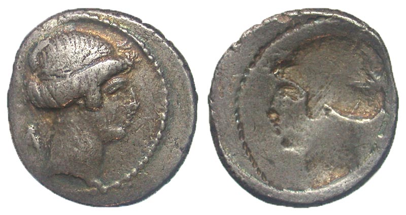 C. Considius Paetus. 46 B.C. AR denarius (19.8 mm, 3.95 g, 1 h). Rome. Brockage. Head of Apollo right, A behind / brockage of the obverse. Crawford 465/2. aVF.