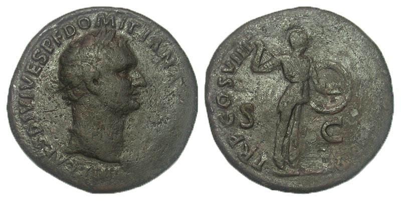 Domitian. A.D. 81-96. Æ sestertius (33.7 mm, 21.76 g, 6 h). Rome, A.D. 82. IMP CAES DIVI VESP F DOMITIAN AVG P M, laureate head right / TR P COS VIII DES VIIII P P S C, Minerva standing right, brandishing spear and holding shield. RIC 103. aVF, minor pitting.