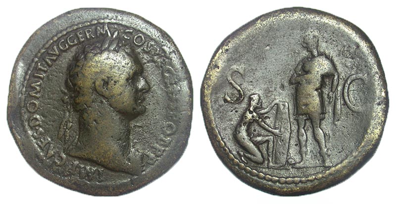 Domitian. A.D. 81-96. Æ sestertius (35.0 mm, 27.73 g, 7 h). Rome, A.D. 85. IMP CAES DOMIT AVG GERM COS XI CENS POT P P, laureate head right, with drapery and aegis on shoulder / S-C, Domitian standing left holding spear, German kneeling at foot offering shield. RIC 357; BMCRE 338. aVF, Rare.