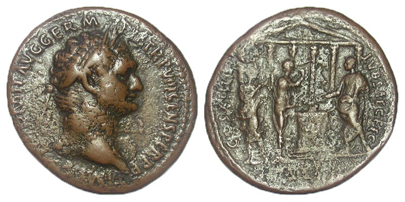 Domitian. A.D. 81-96. Æ as (30.1 mm, 10.40 g, 6 h). Rome, A.D. 88. Secular Games issue. IMP CAES DOMIT AVG GERM P M TR P VIII CENS PER P P , laureate head right / COS XIIII LVD SAEC FEC S C, Domitian standing left, holding patera over altar, harpist left; behind altar,flutist standing right, hexastyle temple with eagle in pediment in the background. RIC 623; BMCRE 434. Fine. An interesting and important historical type, commemorating the Secular Games celebrated by Domitian in October of 88 AD. The reverse sacrificial scene shows the togate emperor standing left, holding patera and sacrificing over garlanded altar, with harpist and double-flute player to left, all before hexastyle Temple of Jupiter Capitolinus in the background.