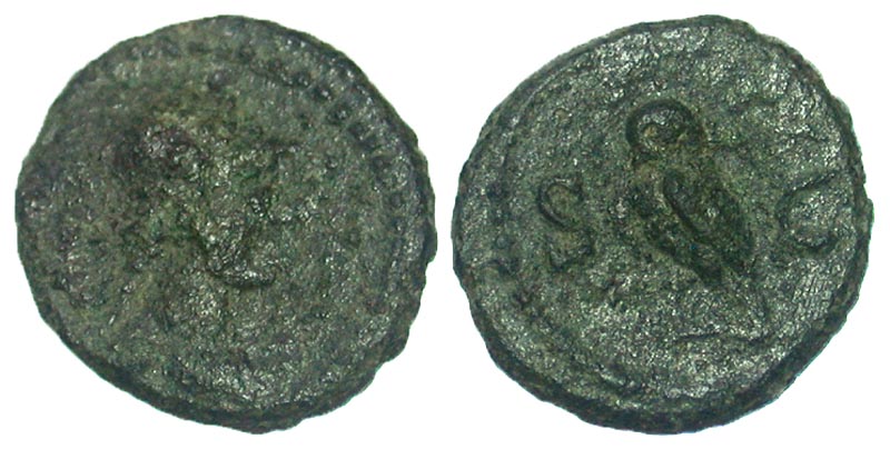 Anonymous. Domitian to Antoninus Pius. Æ quadrans (14.9 mm, 2.51 g, 5 h). Rome, A.D. 81-161. Helmeted and draped bust of Minerva right / S-C, Owl standing right, head facing. RIC 7. Fine.