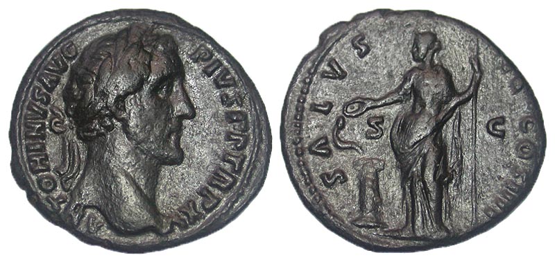 Antoninus Pius. A.D. 138-161. Æ as (27.2 mm, 9.59 g, 5 h). Rome, A.D. 152-153. ANTONINVS AVG PIVS PP TR P XV, laureate head right / SALVS AVG COS IIII S-C, Salus standing left, feeding snake arising from altar and holding scepter. RIC 900a; BMCRE 1904. VF.