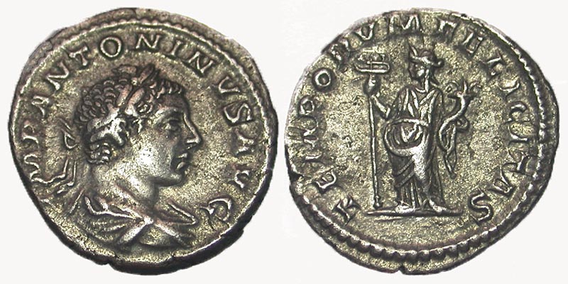 Elagabalus. A.D. 218-222. AR denarius (19.1 mm, 3.00 g, 1 h). Rome, A.D. 219-220. IMP ANTONIVS AVG, lauteate, draped and cuirassed bust right / TEMPORVM FELICITAS, Felicitas standing left, holding long caduceus and cornucopia. RIC 150; RSC 282; BMCRE 168. VF.