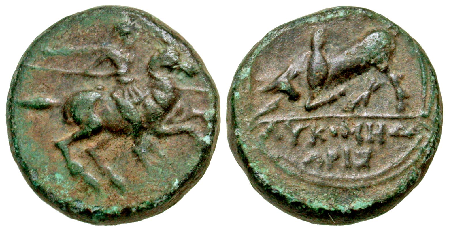 Ionia, Magnesia on the Meander. civic issue. ca. 350-325 B.C. AE 17 (16.8 mm, 4.67 g, 11 h). Magistrate, Lycomedris (?). Horseman galloping right with couched spear / [MAΓN] / ΛYKOMH / ΔRIΣ, ethnic (off-flan) above bull butting left, magistrate's name beneath with uncertain symbol to right; all within meander-pattern border. Cf. SNG Cop. 811 ff.; Cf. SGCV 4487 . VF, dark green patina with small chips (harboring incipient BD?) around edges.