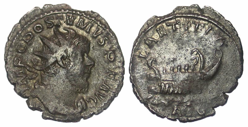 Postumus. Gallic Emperor, A.D. 260-269. AR antoninianus (22.7 mm, 2.50 g, 1 h). Treveri, A.D. 261. IMP C POSTVMVS P F AVG, radiate, draped, and cuirassed bust right / LAETITIA AVG, galley left, with rowers and helmsman. RIC 73; RSC 167a. aVF, toned.