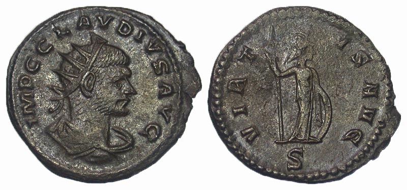 Claudius II Gothicus. A.D. 268-270. Æ antoninianus (21.5 mm, 3.34 g, 6 h). Antioch, A.D. 268. IMP C CLAVDIVS AVG, radiate, draped, and cuirassed bust right / VIRTVS AVG, Minerva standing left, resting hand on shield, holding spear. RIC 225. VF.