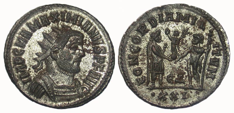 Maximianus. First reign, A.D. 286-305. AR antoninianus (21.4 mm, 3.39 g, 6 h). Antioch, A.D. 293. IMP C M A MAXIMIANVS P F AVG, radiate and cuirassed bust right / CONCORDIA MILITVM, Jupiter presents Victory on a globe to Maximianus; ЄΔ between / ·XXI. RIC 621. VF, fully silvered.