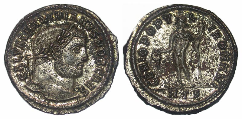 Galerius. As Caesar, A.D. 293-305. Æ Follis (28.1 mm, 9.54 g, 1 h). Heraclea, A.D. 297-298. GAL VAL MAXIMIANVS NOB CAES, laureate head right / GENIO POPVLI ROMANI, Genius standing left, holding patera and cornucopia; HTB in exergue. RIC 20b. VF, silvered.