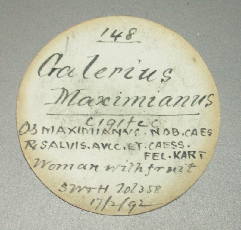 Galerius. As Caesar, A.D. 293-305. Æ Follis (30.0 mm, 10.09 g, 7 h). Carthage, A.D. 303. MAXIMIANVS NOB CAES, laureate head right / SALVIS AVGG ET CAESS FEL KART, Carthage standing left, holding fruits in both hands, I in left field, Δ in exe. RIC 34b. aVF, Scarce. Ex William C Boyd collection, with his ticket, Ex Sotheby's 1892, Ex Baldwin's sale 42, 2005. A scarce coin with an excellent and historical pedigree.