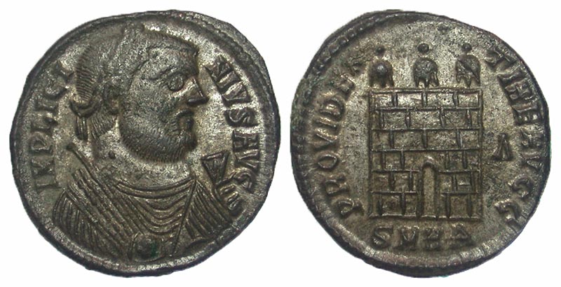Licinius I. A.D. 308-324. Æ 3 (19.3 mm, 3.40 g, 11 h). Heraclea, A.D. 318-320. IMP LICINIVS AVG, laureate bust right wearing imperial mantle, holding globe, mappa and scepter / PROVIDENTIAE AVG, camp gate with three turrets; SMHA/Λ in exergue and field. RIC 48 corr. gVF, silvered.